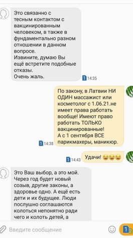 Массажист Ина, проживающая в Риге, рассказала историю, которая произошла с ней в июне с одной так и не состоявшейся клиенткой. От специалиста отказались ввиду идейных соображений - массажист был вакцинирован, это клиентке не понравилось, пишет Ина на своей странице в Facebook.