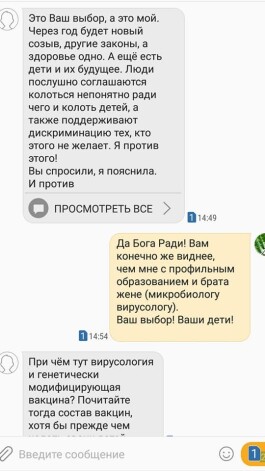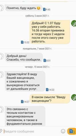 До сих пор не вакцинировалась, ибо все же немного опасалась, что вакцина еще не стабильна, мало изучена и бла-бла-бла. Но, изучив все подробнее. решила, что надо сделать. Запрет на деятельность ускорил процесс. Ну а далее, читайте саму переписку. Возраст оппонента 30+.