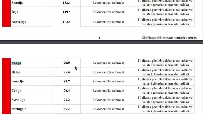 Официальный список стран, из которых необходимо соблюдать несколько дней самоизоляции при въезде в Латвию, можно найти на сайте Центра профилактики и контроля заболеваний (ЦПКЗ, SPKC). Список обновляется каждую пятницу. А последние данные показывают, что Германия все еще находится в красной зоне.