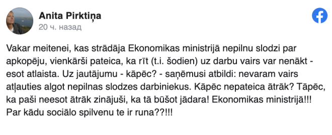"Вчера девушке, которая подрабатывала уборщицей в Минэкономики, просто сказали, что на работу завтра (то есть сегодня) приходить не нужно - ее уволили. На вопрос "почему?" она получила ответ: мы больше не можем себе позволить нанимать работников на полставки. Почему не сказали этого раньше? Потому что они не знали, что им придется это сделать! Минэкономики!!! О какой социальной подушке мы тут вообще можем говорить??!", - негодует Анита в Facebook.