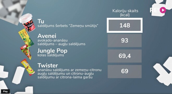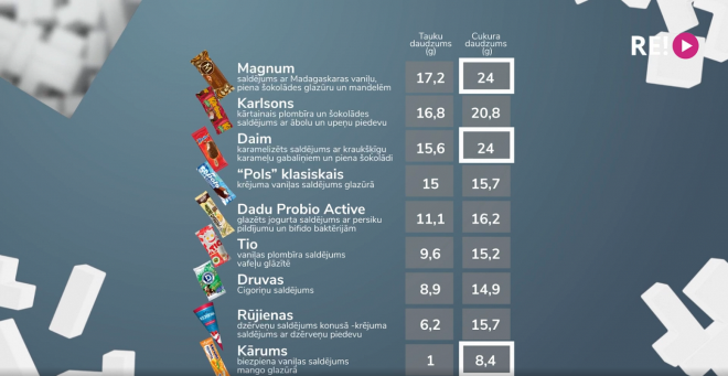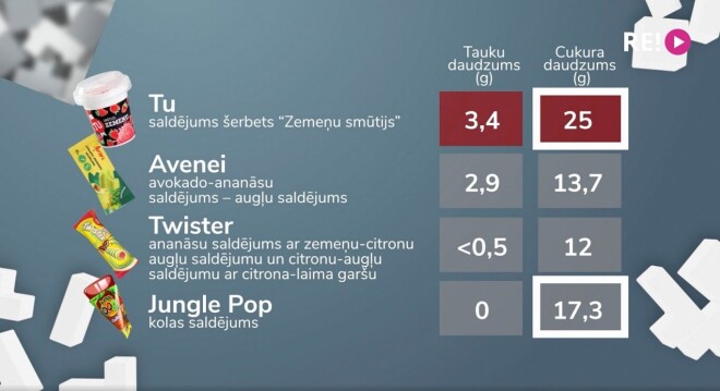 В передаче также рассказали, сколько жира и сахара содержит доступное в латвийских магазинах порционное мороженое. Эти вещества дают человеку хорошее самочувствие и чувство покоя — но нужно учитывать, что эта комбинация может вызвать привыкание. Специалисты не советуют в сутки употреблять более 25 граммов сахара, что равно примерно 5-6 чайным ложкам.