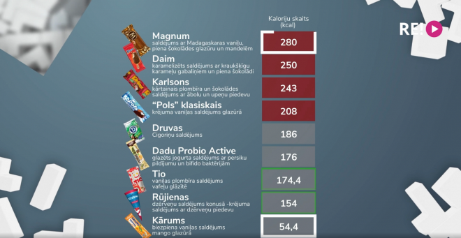 Среди популярных в Латвии видов мороженого больше всего калорий, жира и сахара — в миндальном Magnum, карамельном Daim и Karlsons с начинкой из яблок и смородины, выяснили авторы передачи Латвийского Телевидения «Продовольственный ревизор» (Pārtikas revidents). А меньше всего — в Jungle Pop с колой, творожном Kārums с глазурью со вкусом манго и ананасовом Twister.