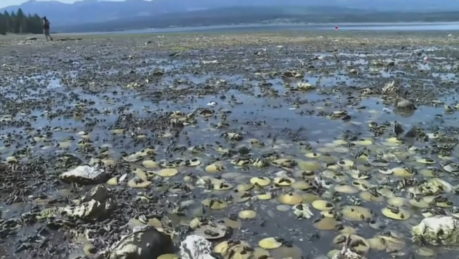 На сотни километров прибрежной зоны Канады выкинуло пустые раковины мидий, улиток, моллюсков и морских звезд, которые живут на скалистых берегах тихоокеанского побережья Британской Колумбии. Они фактически сварились в воде на мелководье.