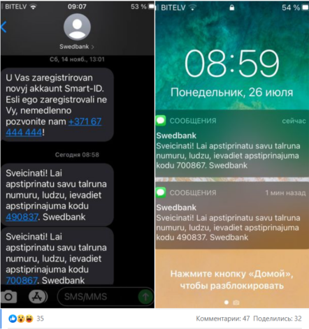 Дальше, мне прислали смс от имени Swedbank (даже два) с просьбой подтвердить номер своего телефона (!), для этого нужно ввести код (он в смс), предварительно (естественно), идентифицировавшись через интернет-банк.
