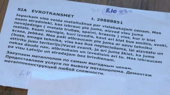 Ранней весной двое мужчин приехали во двор Индры, жительницы села Берзе. Они предложили собрать ненужный металлолом. Индра подумала и решила сдать металлолом, но теперь она горько об этом жалеет, сообщает программа Bez Tabu на TV3.