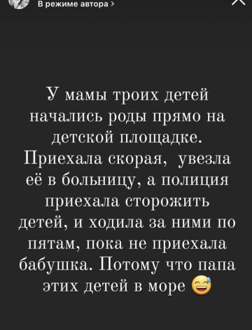 Как сообщает очевидица, полицейские не отходили от детей ни на секунду, пока не приехала их бабушка. "У мамы троих детей начались роды прямо на детской площадке. Приехала скорая, увезла ее в больницу, а полиция приехала сторожить детей. Ходили за ними по пятам, пока не приехала бабушка. Потому что папа этих детей - в море", - написала очевидица в истории в Instagram.