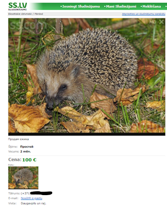 На портале объявлений ss.lv некий мужчина в Даугавпилсе продавал ежика за 100 евро, сообщает Департамент охраны природы.