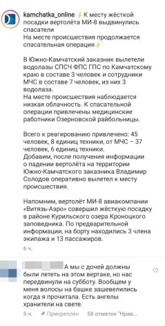 На Камчатке упал вертолет с группой туристов на борту, есть серьезно пострадавшие и без вести пропавшие. Оксана Н. должна была вместе с маленькой дочерью лететь вместе с другими пассажирам, но в последний момент ей предложили поменять дату. Девушка, скрепя сердцем, согласилась, но, как оказалось, не зря.