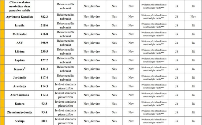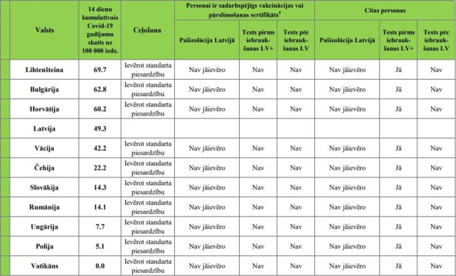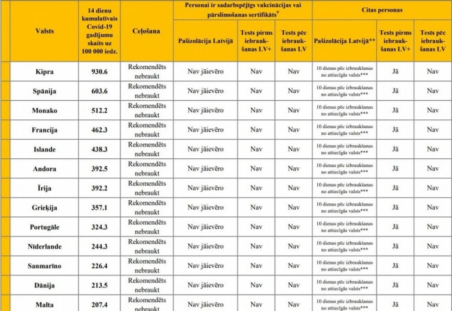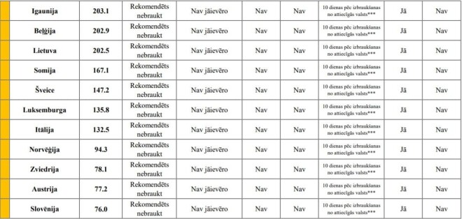 Путешественникам, которые въезжают в Латвию или возвращаются из любого государства ЕС/ЕЭЗ, включенного в «зеленый» или «желтый список», имеющих сертификат вакцинации или переболевших самоизоляцию можно не соблюдать. Список «надежных» стран, где заболеваемость Covid-19 не превышает 75 случаев на 100 000 жителей.