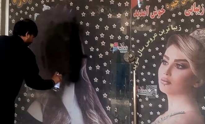 Видео, опубликованное на странице новостного агентства, демонстрирует, как один из владельцев закрашивает рисунок с женским лицом. В руках он держит баллончик с черной краской. Также Pajhwok показал кадры голых стен другого салона, с которых сорвали плакаты с изображениями женщин.