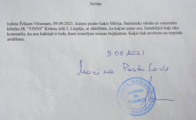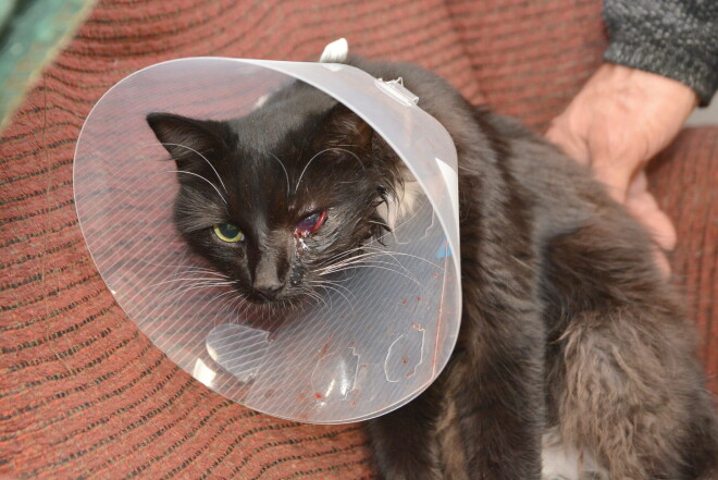 На животном надет послеоперационный воротник, так как днем ранее ветеринар из уголка левого глаза кошки извлекла пулю для пневматического оружия, застрявшую в кости, пишет Liepajniekiem. На месте травмы еще заметен сильный отек и кровь. У хозяина, при взгляде на свою любимицу, и у самого глаза увлажняются. Ветеринарный врач, которая оперировала кошку, вселила надежду, что глаз удастся сохранить. «Мы с женой по очереди всю ночь спали на полу рядом с кошечкой, так как она была очень пуглива, не понимала, что с ней произошло», – рассказал Э.Вилсонс.