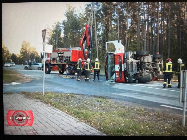 Примерно в 16:00 на обочине шоссе загорелась машина. На этот вызов выехала пожарная служба. Но уже приближаясь к месту происшествия на повороте на Упесциемс, пожарная машина попала в серьезную аварию.