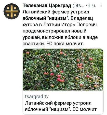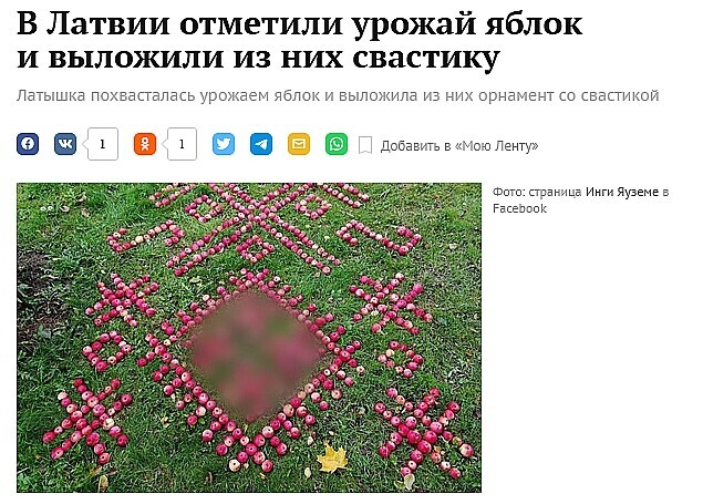 Латвийский фермер устроил яблочный «нацизм» - такой заголовок появился на российском портале телеканала "Царьград". "Владелец хутора в Латвии продемонстрировал новый урожай, выложив свастику", - выразил тревогу и портал "Лента.ру". Данная информация активно распространяется и в социальных сетях, задается вопрос, "почему молчит Евросоюз". О чем идет речь?