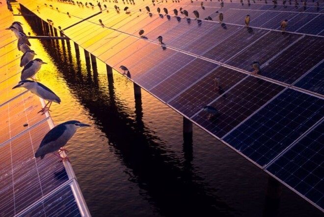 Большая группа цапель расселась на солнечных панелях в сумерках