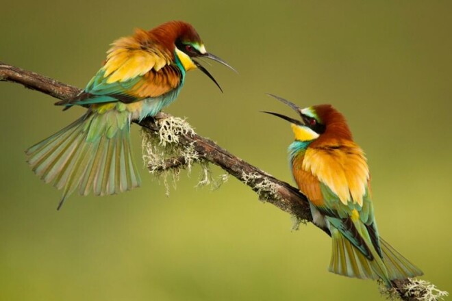Щурки на ветке. Эту гнездящуюся в Южной Европе птицу легко узнать благодаря ярко окрашенным перьям
