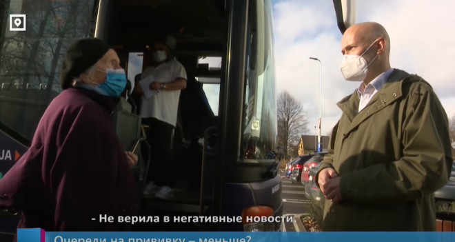 В основном министру здравоохранения удалось поговорить с журналистами. Людей, которые пришли вакцинироваться на улицу Лубанас, днем было не так много. Но, как говорит водитель вакцинационного автобуса, иногда от желающих привиться отбоя нет. «Нам уезжать на новое место, а он только пришел: «Пожалуйста, пожалуйста». А нельзя. Человеку после вакцины надо посидеть — минимум 10 минут, а нам уже на следующее место. Более такие нервные — не хотят ничего уступить старому человеку. Вот если бы эта бабушка подошла в конец очереди, и я ее волок бы в автобус без очереди, шуму было бы — ужас! Слава богу, у меня есть бумажка: могу показать указания, что я должен так делать», — поделился Райтис Аугшциемс, водитель автобуса вакцинации.