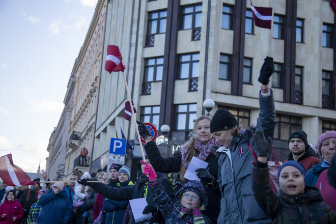Сегодня в полдень несколько тысяч человек собрались в центре Риги, чтобы посмотреть приветствие Национальных вооруженных сил (НВС) по случаю 103-й годовщины провозглашения Латвийской Республики.