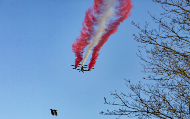 Парад начался с воздушной техники, которая пролетела над памятником и направилась в сторону улицы Бривибас. Один из самолетов оставил после себя дым, окрашенный в цвета государственного флага Латвии.