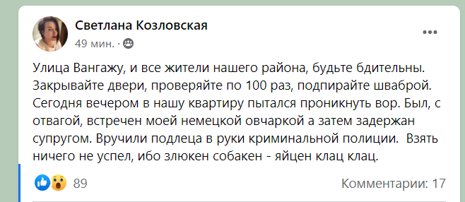 Женщина поделилась в группе "Югла" на Facebook, что чуть было не стала жертвой вора. В этот раз все обошлось, однако могло закончиться гораздо хуже. "Улица Вангажу и все жители нашего района, будьте бдительны. Закрывайте двери, проверяйте по 100 раз, подпирайте шваброй. Сегодня вечером в нашу квартиру пытался проникнуть вор. Был с отвагой встречен моей немецкой овчаркой, а затем задержан супругом. Вручили подлеца в руки криминальной полиции. Взять ничего не успел, ибо злюкен собакен - яйцен клац клац", - гласит запись от 21 ноября.