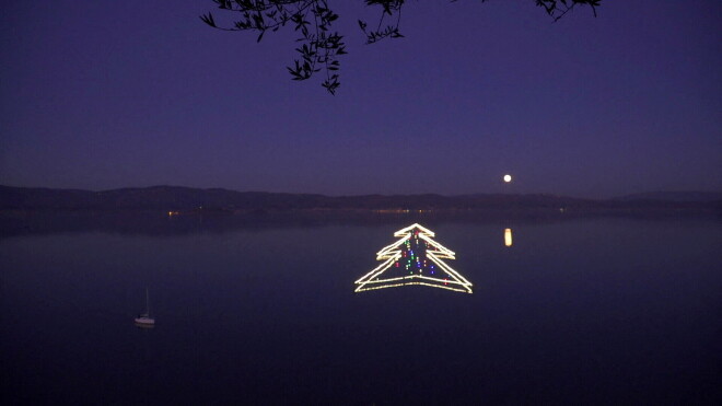 Захватывающий вид открывается сейчас на озеро Кастильоне дель Лаго (Castiglione del Lago) в Италии. Здесь установлена самая большая в мире плавучая ель. Посмотреть на нее съехались туристы со всей страны.