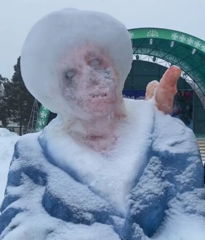 Говорят, что причиной такого внешнего вида скульптуры стала оттепель. До этого Снегурочка выглядела очень даже пристойно.