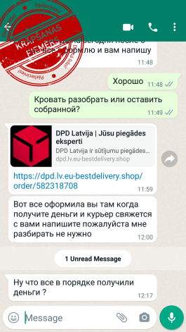 - При заключении сделки мошенники отправляют продавцу интернет-ссылку, по которой продавец попадает на поддельный сайт, который лишь визуально напоминает портал DPD Latvija и/или Omniva.