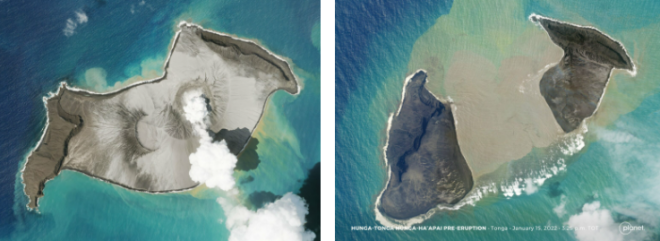 Стоит отметить, что Хунга-Тонга-Хунга-Хаапай начал проявлять активность еще в декабре 2021 года. Снимки, сделанные аппаратами компании Planet, показывают процесс постепенного «исчезновения» небольшого острова, который располагался над вулканом. Первый кадр был сделан 7 января 2022 года, второй — 14 января, всего за несколько часов до колоссального извержения.