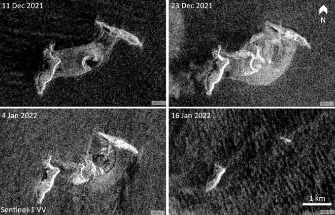Судя по всему, извержение полностью уничтожило остров. Об этом говорят радарные изображения, полученные спутником проекта Sentinel-1. Сделанный сразу после извержения вулкана снимок демонстрирует фактическое исчезновение острова.