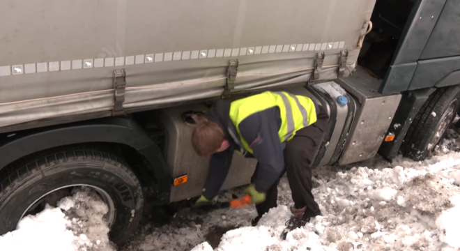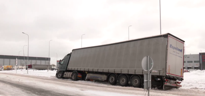 "Чистый лед. От границы с Литвой сюда мы все ехали со скоростью 40 километров в час. Чистый лед! [Как дела у Вас в стране? - ред.] У нас посыпано, все нормально. У нас можно ехать 70-80 километров в час. Как въехал в Латвию, так все. Очередь в Бауску, потом очередь из Бауски в Иецаву", — негодует водитель грузовика.