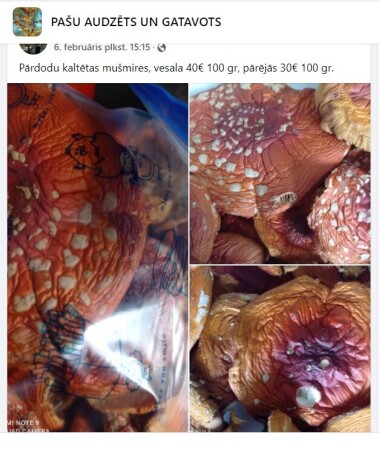 В группе на Facebook (Pašu audzēts un gatavots) можно найти рекламу Саниты из Тукумса (Латвия) - она продает сушеные красные мухоморы. Целый гриб - 100 грамм по 40 евро, остальные по 30 евро. При виде такого на ум приходят детективные романы Агаты Кристи.