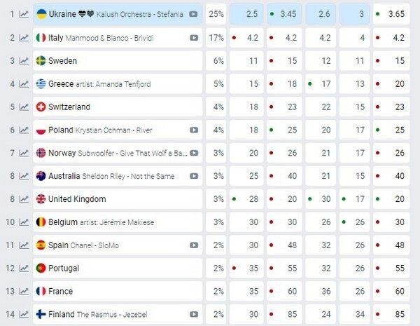 После нападения России на Украину европейское сообщество активно отдает свои голоса за украинского представителя — группу Kalush Orchestra с песней «Стефания». По обновленным прогнозам букмекером коллектив стал безоговорочным лидером. Об этом сообщается на официальном сайте Eurovision World.