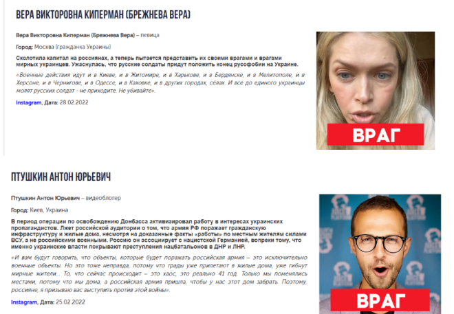Среди "врагов" можно найти имя уроженки Днепродзержинска, певицы Веры Брежневой (Вера Киперман), бывшей солистки группы "ВИА Гра". О ней сообщается следующее: "Сколотила капитал на россиянах, а теперь пытается представить их своими врагами и врагами мирных украинцев. Ужаснулась, что русские солдаты придут положить конец русофобии в Украине".