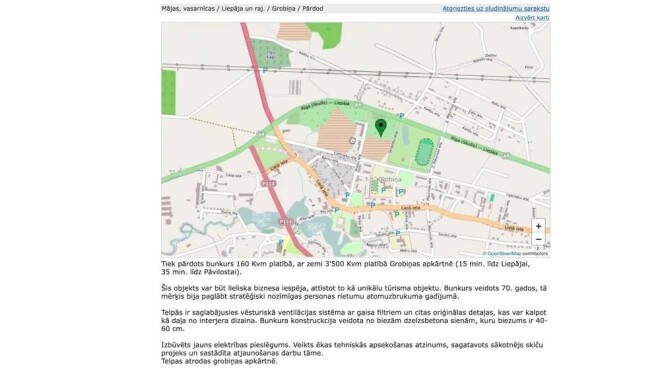 Недвижимость находится в Гробиньской волости. Связавшись с продавцом бункера, журналистам удалось выяснить, что объект все еще продается. "Он был построен в 1970-х годах, да. Ну, то, что есть сейчас, не совсем удобно. Скоро электричество проведут, но надо думать о каком-то ремонте бункера", - говорит брокер в телефонном разговоре.