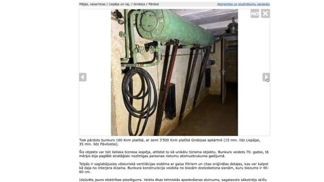 В интернете опубликовали объявление, в котором говорится о продаже бункера общей площадью 160 квадратных метров в Гробине (Латвия). Его цена составляет примерно 35 000 евро, сообщает программа Bez Tabu на TV3.