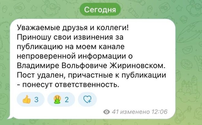 Утром сообщалось, что на 76-м году жизни скончался российский политик Владимир Жириновский. Потом эту новость опровергли. Сенатору, подтвердившему смерть Жириновского, даже пришлось извиняться.