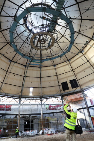 С начала реконструкции построены главные несущие конструкции над новой плитой фундамента, на котором через опорные колонны установлен железобетонный ригель, а на нем смонтирован купол. Сейчас проводятся работы всех видов по прокладке инженерных коммуникаций, а также начаты работы по строительству и отделке кровли.
