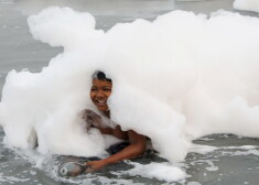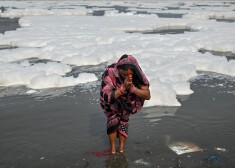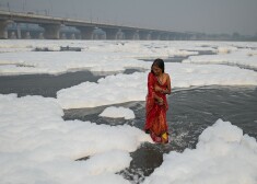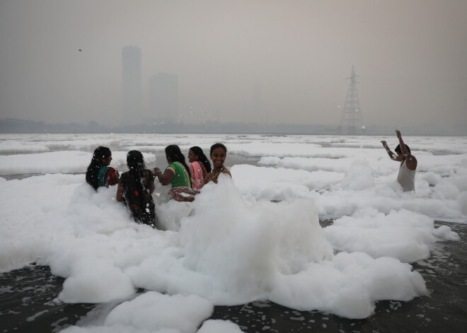 Индийцы купаются в ядовитой пене в священной реке Ямуна