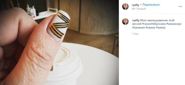 Также дизайн в стиле Z рисуют частные мастера и работники салонов красоты. Пользовательницы «ВКонтакте» показывали фото ногтей и с гордостью рассказывали, как подобным образом они поддерживают родину. Самые креативные просили нарисовать букву Z в цветах георгиевской ленточки.