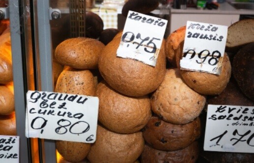 На рынке также можно купить батон хлеба, если не дешевле, то точно вкуснее. Например, на стенде Лимбажского хлебушка Liepkalni можно купить такую "экзотику", как не нарезанную ломтиками буханку хлеба. В пекарне Sala предлагает купить только что испеченный продукт, но цена на него может "укусить" кошелек того, кто считает каждый цент.