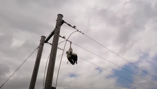 Жуткое зрелище: в Видземе на проводах колышется мертвый аист