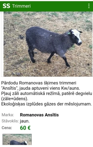 Объявление быстро разлетелось в Facebook и Twitter, где "рекламой" поделились несколько сотен человек: "Продам триммер Романовской породы Ansītis. Мощность около 1кВт/баран. Косит траву в автоматическом режиме, расходует топливо (трава + вода). Экологические выхлопные газы подходят для удобрений. Цена: 60 евро".