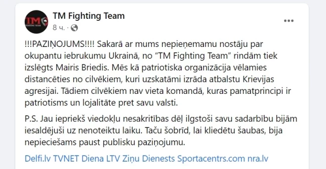 Информация о таком шаге появилась в Facebook. "В связи с неприемлемой для нас позицией о вторжении оккупантов в Украину из рядов TM Fighting Team исключается Майрис Бриедис. Мы как патриотическая организация хотим дистанцироваться от людей, которые наглядно демонстрируют поддержку российской агрессии. Таким людям не место в команде, основные принципы которой - патриотизм и лояльность к своей стране", - гласит сообщение.