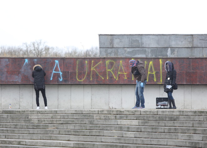 Активисты чистят памятник Победы, который облили голубо-желтой краской