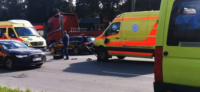 На обочине Улманя гатве валяется полностью разбитый мотоцикл Harley Davidson, а посреди дороги, на сплошной линии, стоит медицинский транспорт, который врезался в мотоциклиста. Такую картину можно было наблюдать во вторник.