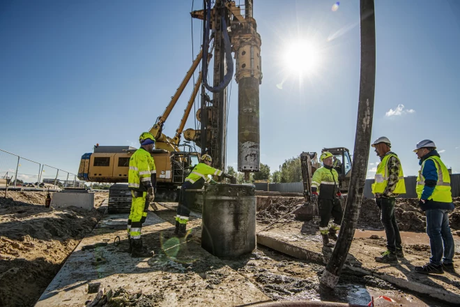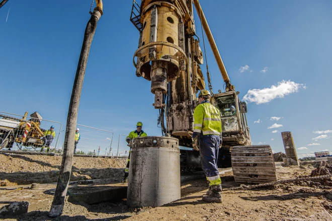 Балтгалве рассказала, что сваи эстакады возводятся на участке между улицей Торню и дорогой P133, в том числе для возведения 30-метровых свай используется специальная технология строительства Kelly-Casing, которая предполагает бурение и бетонирование свай вместо забивания. Технология была выбрана для снижения воздействия на окружающую среду и инфраструктуру, чтобы не создавать нежелательных шумов и вибраций в процессе строительства. Сначала с помощью специального оборудования устанавливается обсадная труба сваи, затем начинается бурение грунта. Далее устанавливается арматурный каркас и бетонируются сваи, в завершение процесса из полости вытягивается обсадная труба.