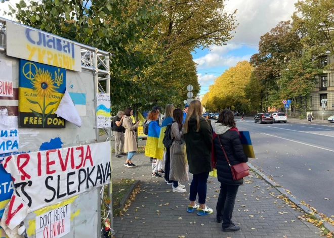 В понедельник у посольства России в Риге собралась небольшая группа людей, которая пела гимн Украины и скандировала лозунги, осуждающие российскую ...