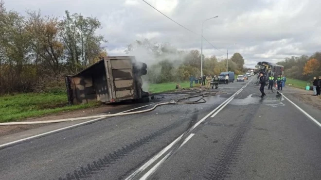 Международный автобус, который следовал из Петербурга в Ригу, столкнулся с КамАЗом лоб в лоб. В итоге большегруз загорелся. По рассказам очевидцев, грузовик был подрезан легковым автомобилем, после чего врезался в автобус.