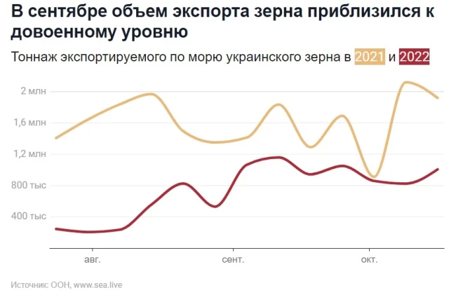 За август — октябрь из портов Украины удалось вывезти более половины из запаса в 18 млн тонн, а в октябре объем экспорта и вовсе почти восстановился.