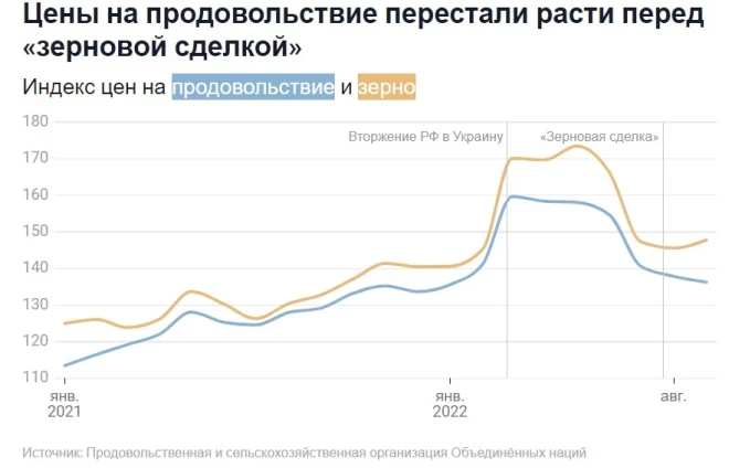 В июле под давлением ООН Россия всё же решилась заключить «зерновую сделку». Четыре стороны — ООН, Россия, Украина и Турция — договорились о создании безопасного морского коридора для прохода судов с зерном из трех украинских портов на срок 120 дней с возможностью автоматического продления.