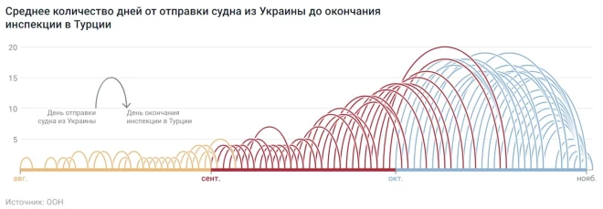 Параллельно начали затягиваться проверки кораблей в Турции. По соглашению, каждое судно должна проверять международная инспекция, чтобы борт не провез нелегальные грузы или людей. Если в августе на инспекцию одного сухогруза в среднем уходило менее трех дней, то в сентябре — уже почти девять, а в октябре — более тринадцати.